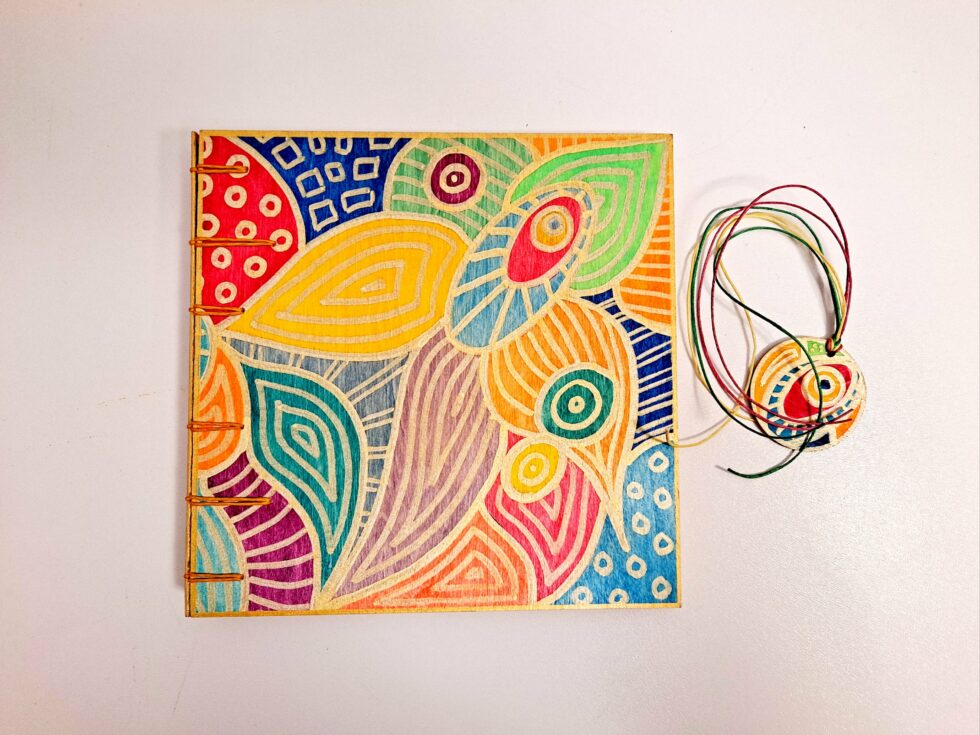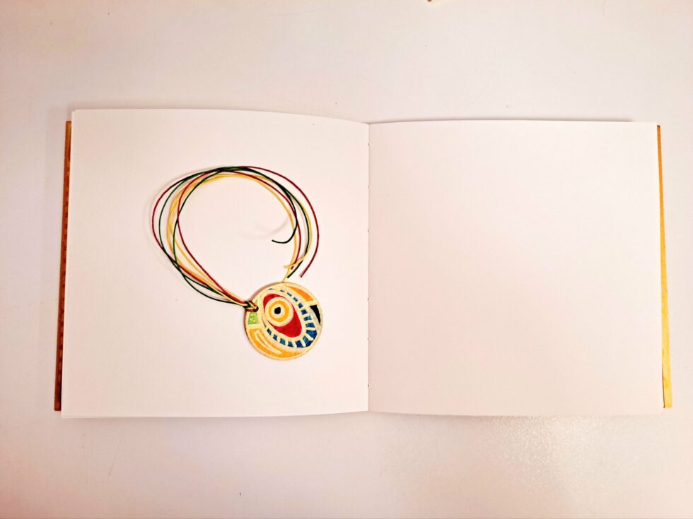 Album DREAMS et son marque-pages assorti, pièce unique, format 20x20x2.5 cm, couverture en bois peint à la main, reliure secrète Belge, 80 pages cousues, papier blanc Clairefontaine 180g/m² Acid free.