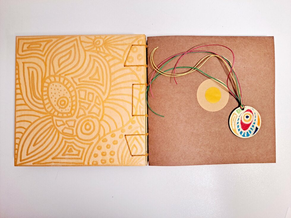 La reliure est réalisée à la main selon la technique appelée reliure Secrète Belge ou encore Criss-Cross. On doit cette technique à Anne Goy. Elle est visible à l’intérieur et à l’extérieur du carnet. Elle permet une ouverture à plat et une grande solidité. La couleur du fil de reliure s’harmonise avec le motif peint.
