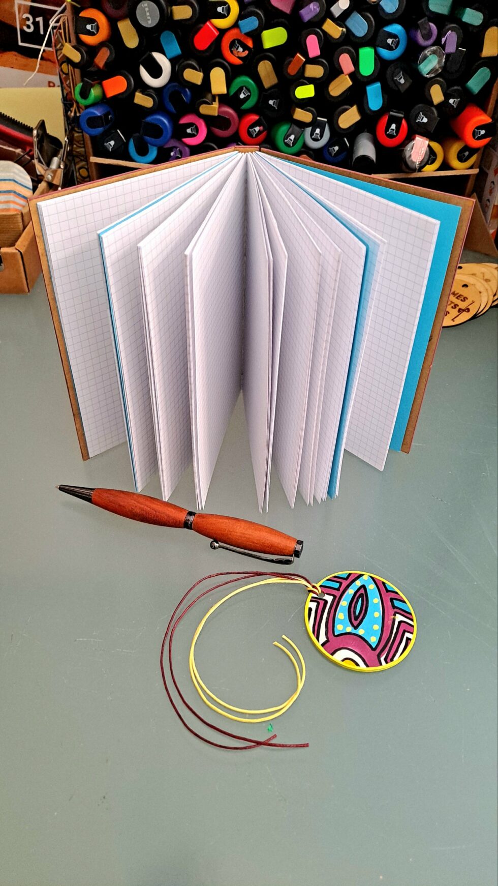 Je choisis des feuilles de bois pour la fabrication de Mes p’tits carnets. Le bois est le matériau le mieux adapté que j’ai trouvé. Il est un bon support pour mes peintures : il ne gondole pas et il ne se craquelle pas. Aussi, il assure une bonne résistance au carnet. J’ai choisi de ne pas utiliser de colle car le collage ne répond pas à mon envie de tendre le plus possible vers une éco-conception de Mes p’tits carnets. De plus, l’utilisation de colle rend plus difficile le processus de recyclage des papiers et des cartons, même à très faible dose. C’est pourquoi la couverture et les pages de Mes p’tits carnets sont 100% cousues !