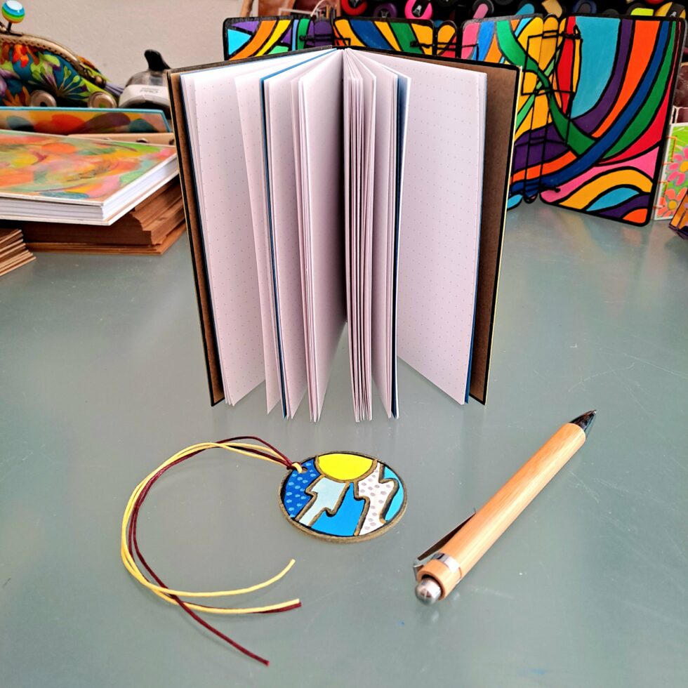 Carnet Bonne Mère et son marque-pages assorti, format A6, couverture en bois peint à la main, reliure secrète Belge, 96 pages cousues, papier blanc pointillés 90g.