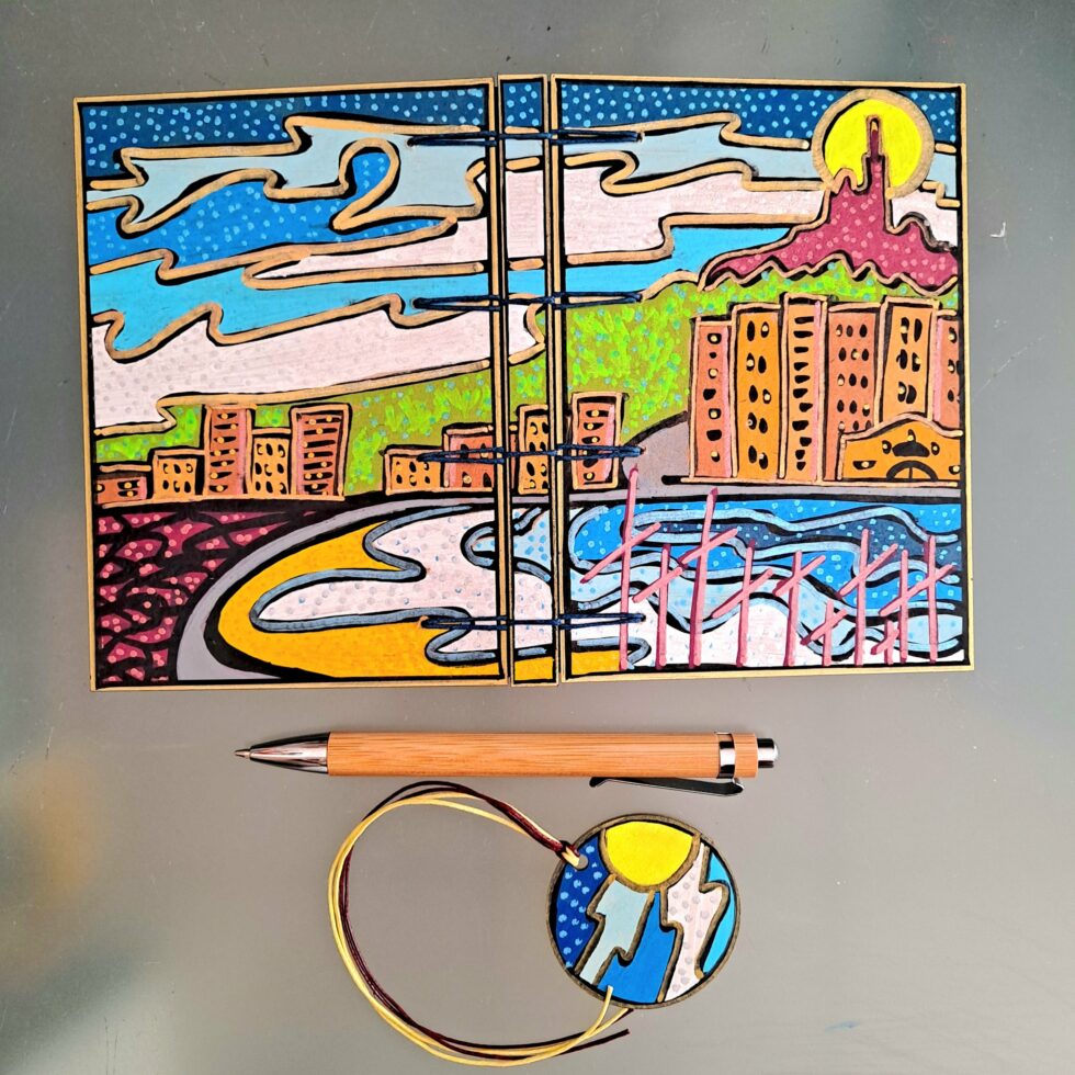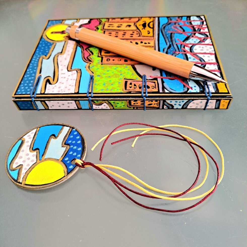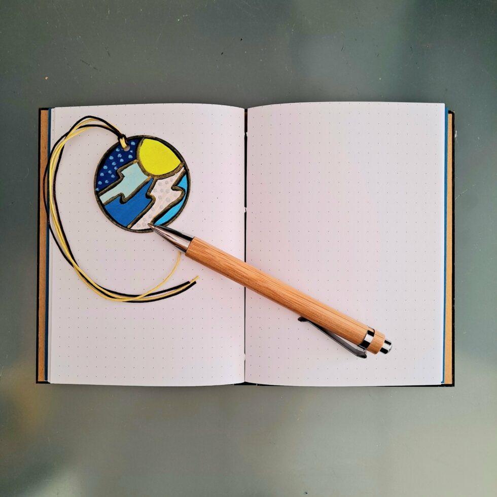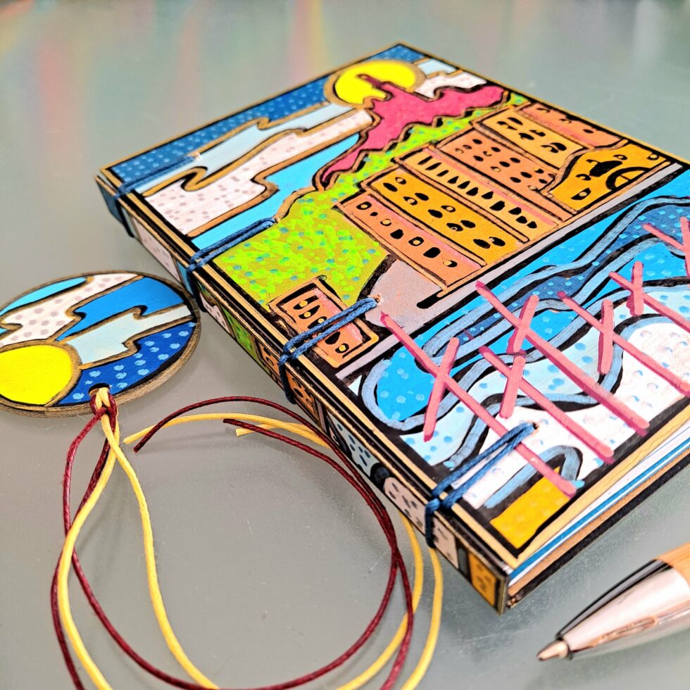 Je choisis des feuilles de bois pour la fabrication de Mes p’tits carnets. Le bois est le matériau le mieux adapté que j’ai trouvé. Il est un bon support pour mes peintures : il ne gondole pas et il ne se craquelle pas. Aussi, il assure une bonne résistance au carnet. J’ai choisi de ne pas utiliser de colle car le collage ne répond pas à mon envie de tendre le plus possible vers une éco-conception de Mes p’tits carnets. De plus, l’utilisation de colle rend plus difficile le processus de recyclage des papiers et des cartons, même à très faible dose. C’est pourquoi la couverture et les pages de Mes p’tits carnets sont 100% cousues !