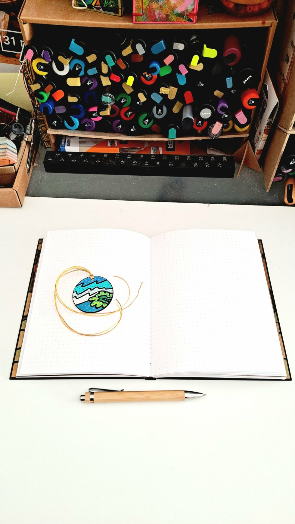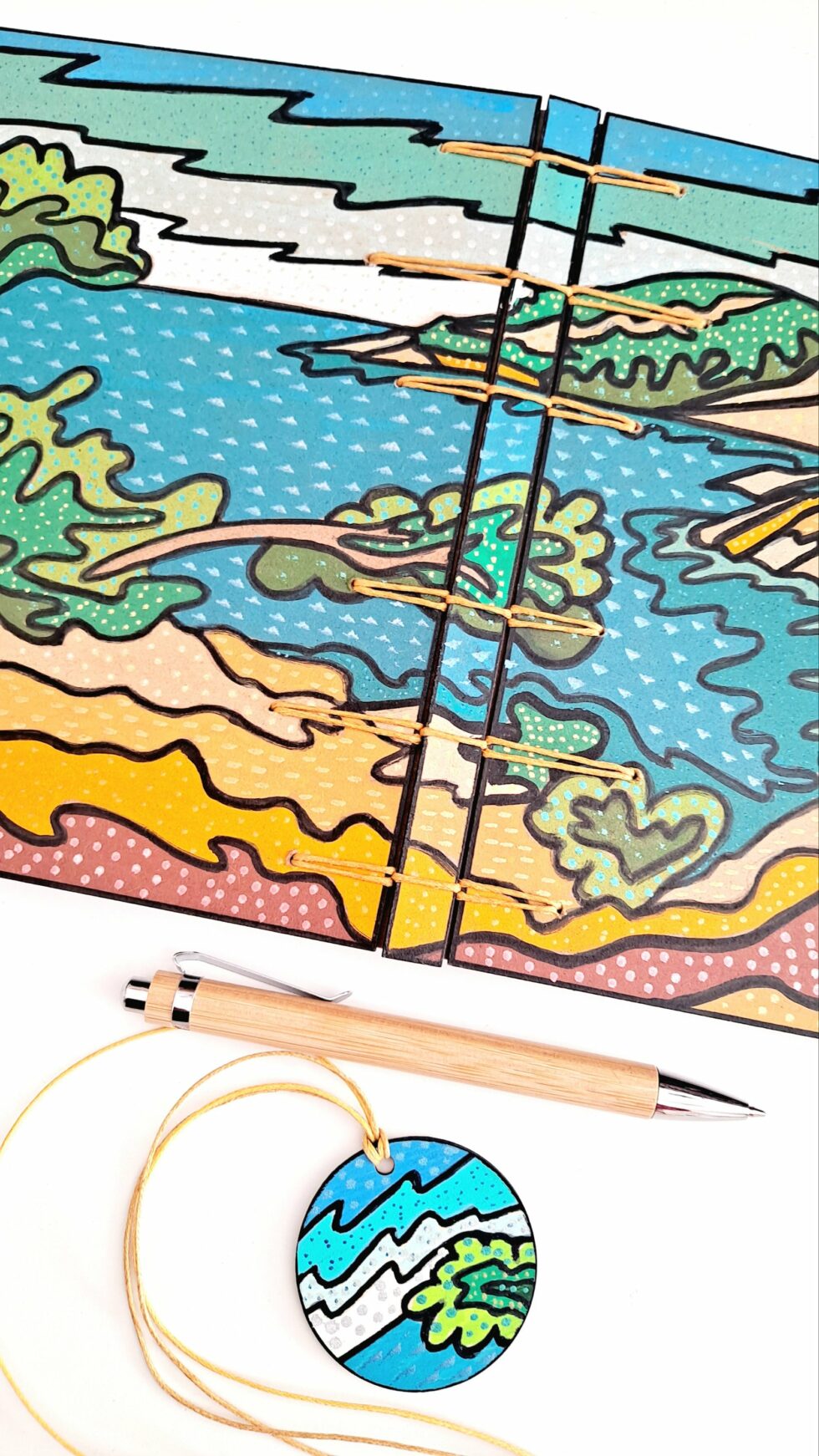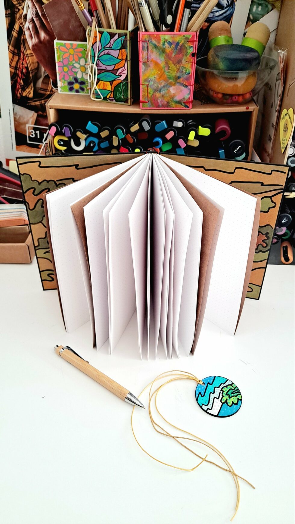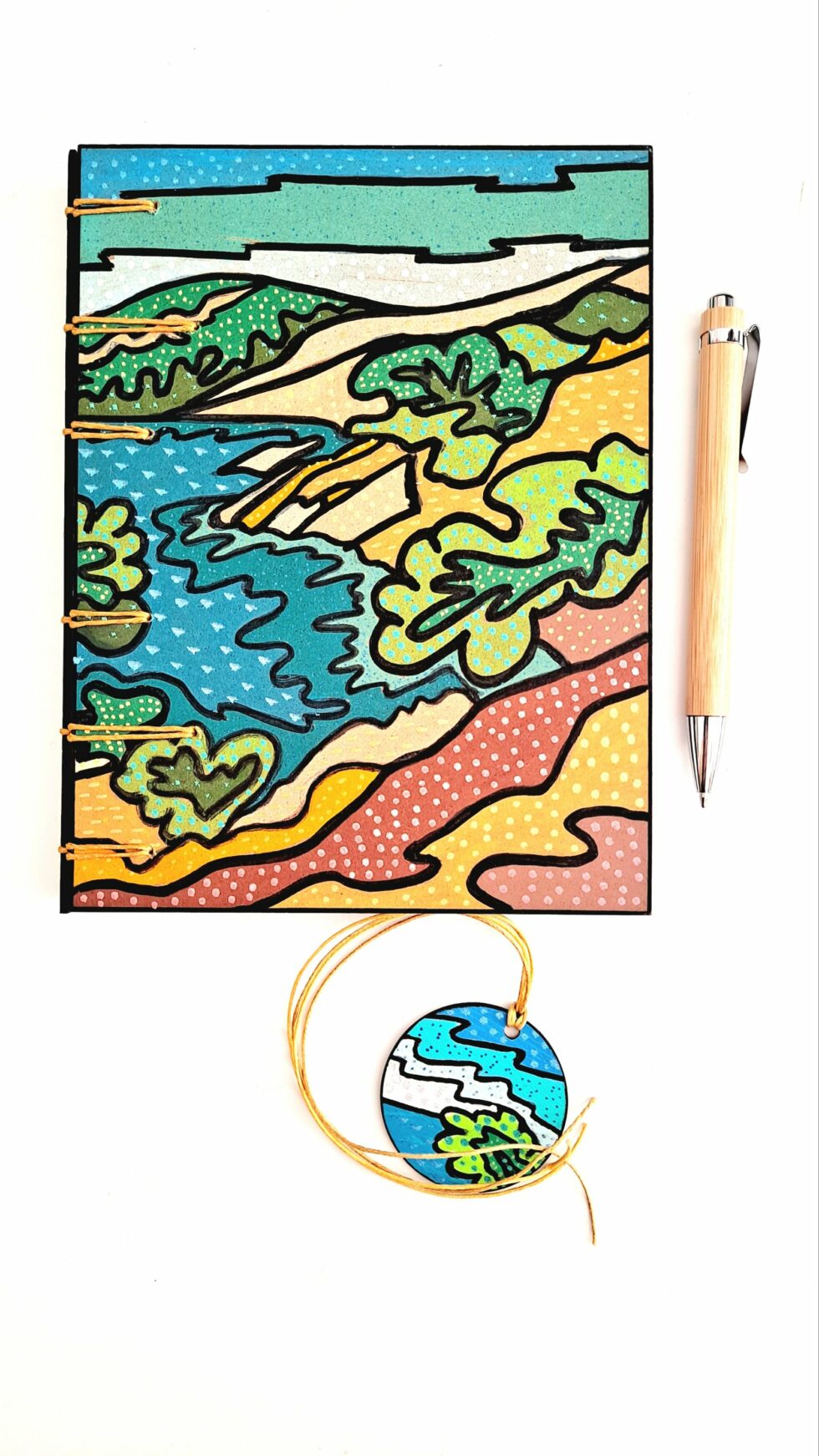 Notebook EMBRUNS et son marque-pages assorti, format A5, couverture en bois peint à la main, reliure et pages cousues, papier pointillés 90g/m².