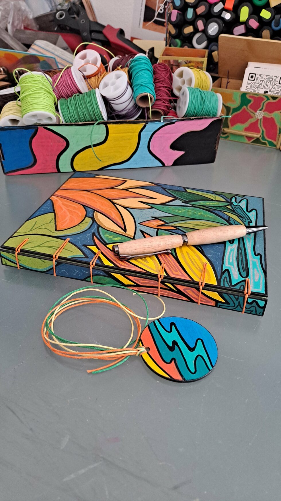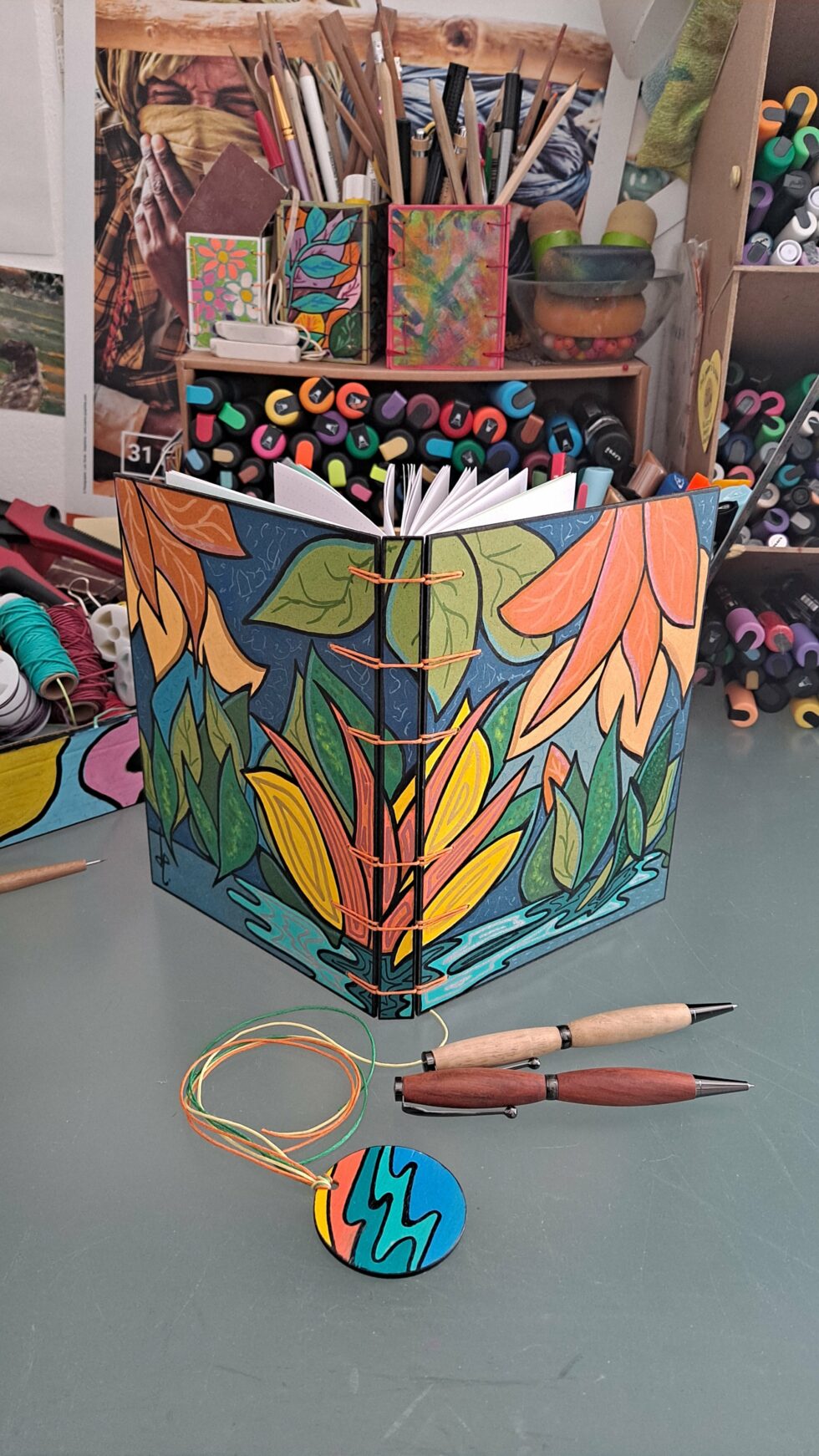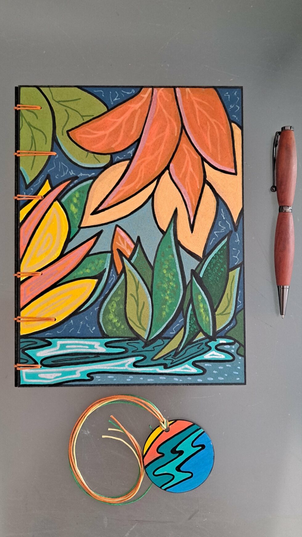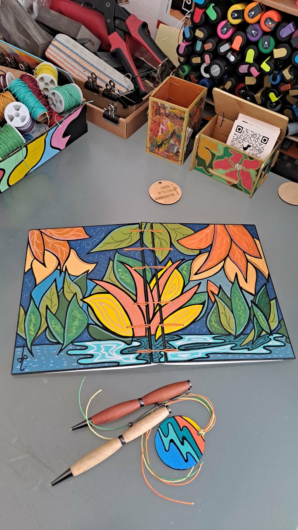 Carnet PALMA et son marque-pages assorti, créés entièrement à la main, en un seul exemplaire, dans mon atelier à Marseille.
