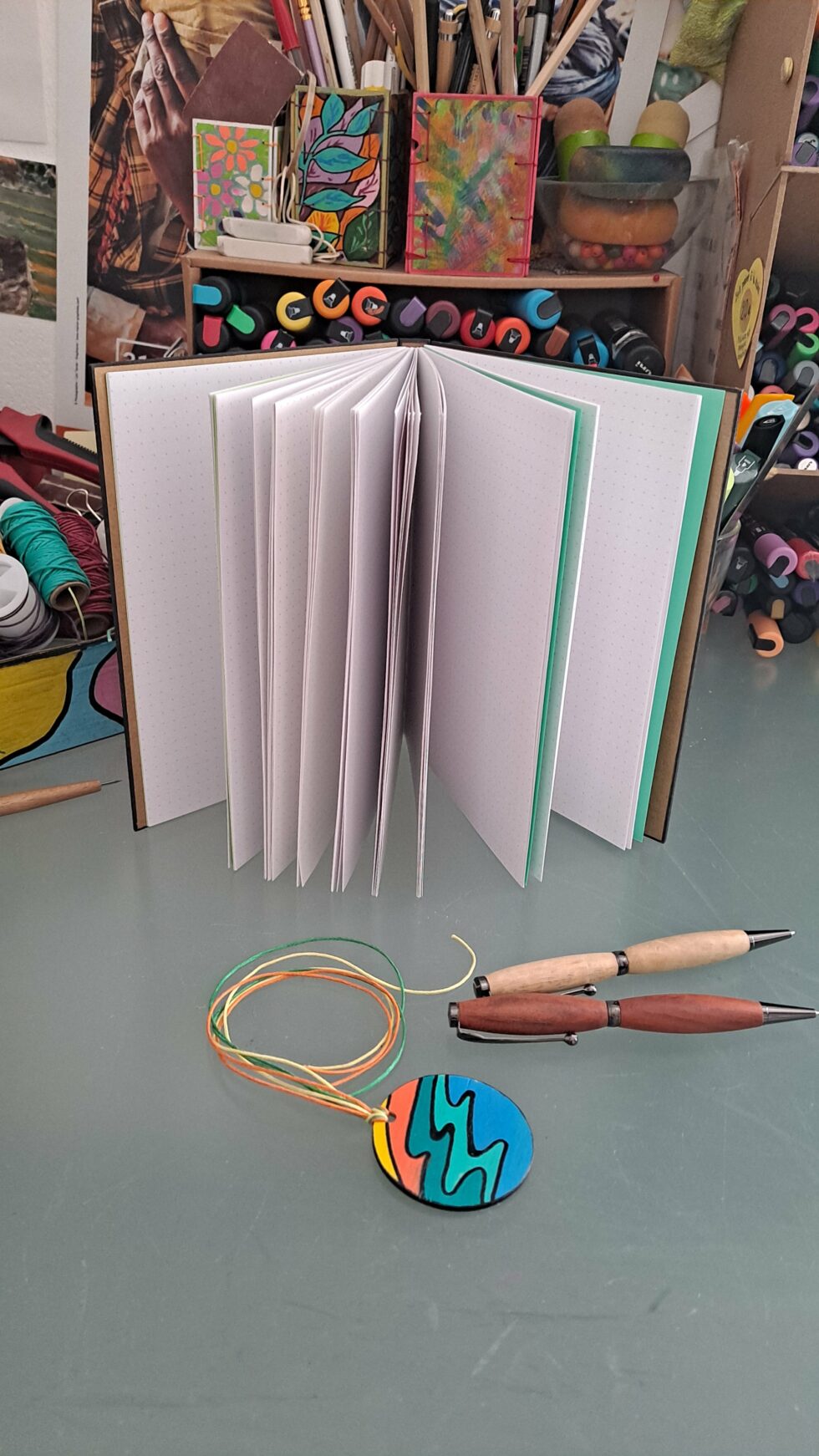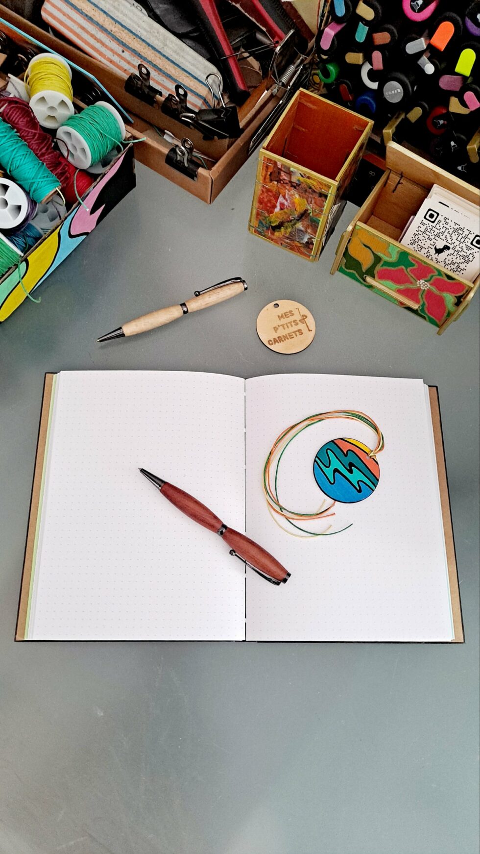 Carnet PALMA et son marque-pages assorti, format A5, couverture en bois peint à la main, reliure cousue à la main, 127 pages cousues, papier pointillés 90g/m², ouverture à plat.