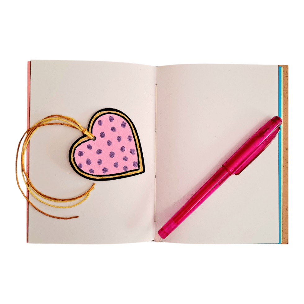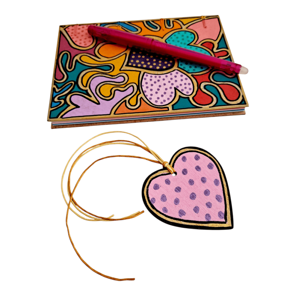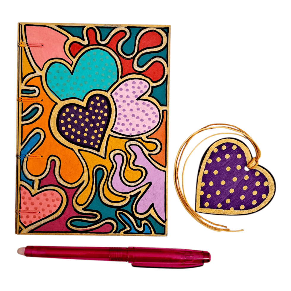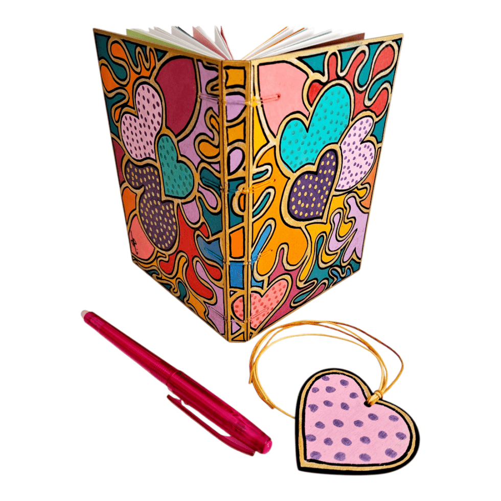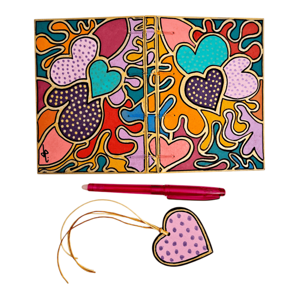 Carnet MY LOVE et son marque-pages assorti, pièce unique, 1 exemplaire disponible. Couverture en bois peint à la main, format A6, reliure Criss-Cross, composé de 7 cahiers de 12 pages cousues, papier blanc 90g/m².