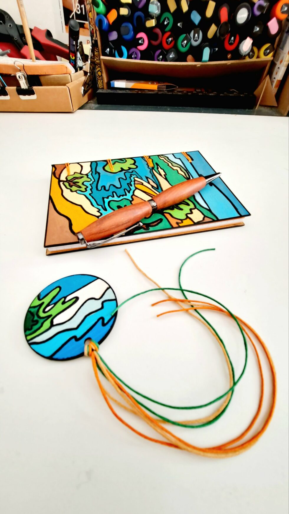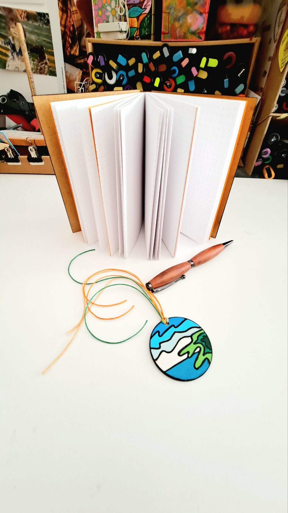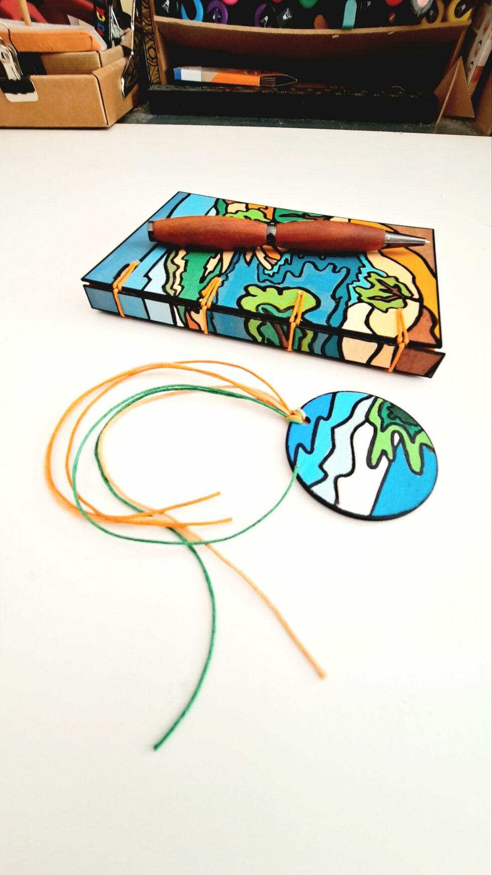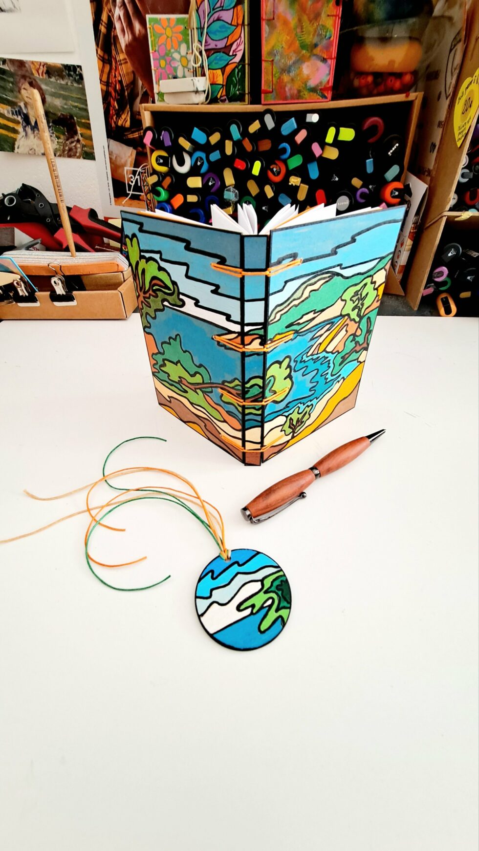 Carnet artisanal en bois peint, pièce unique cousue à la main.