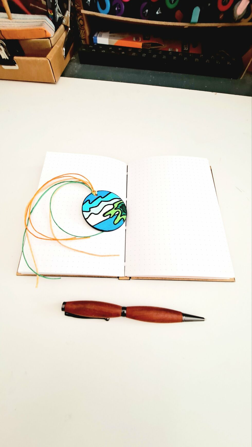 Carnet RÉCIF et son marque-pages assorti, pièce unique, format A6, couverture en bois peint à la main, reliure et pages cousues, papier pointillés 90g/m².
