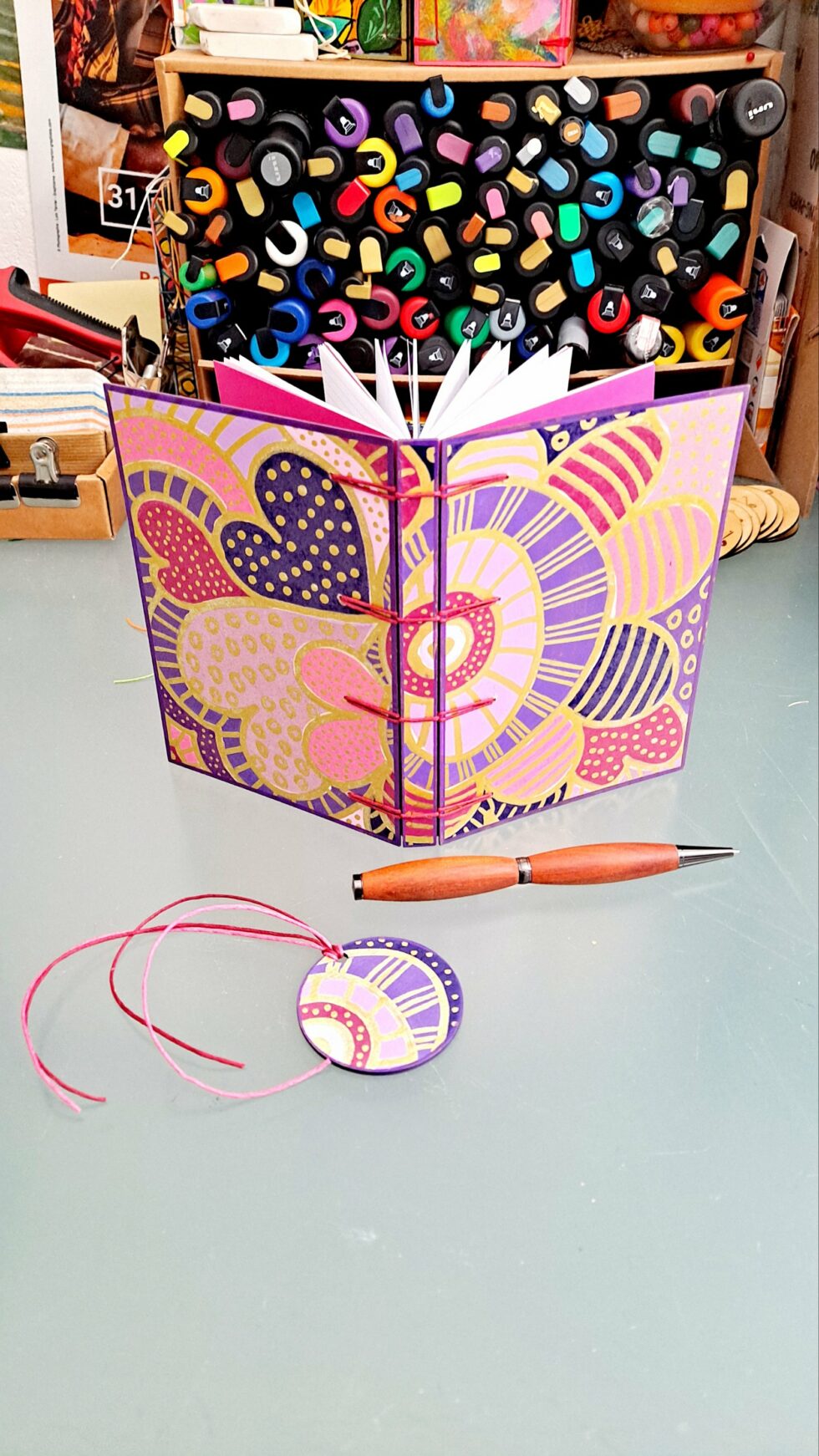 Je couds à la main la reliure de Mes p’tits carnets, elle est apparente à l’extérieur et à l’intérieur du carnet. C’est la reliure secrète belge ou reliure Criss-cross. On doit cette technique à Anne Goy. Cette reliure est l’assemblage des 3 parties de la couverture (recto, dos, verso) par une couture entrecroisée. Le résultat à la fois solide et esthétique. Elle permet une ouverture à plat du carnet. Les points de perçage de la reliure varient en nombre et en distance pour créer des variantes et la couleur du fil s’harmonise avec le motif peint.