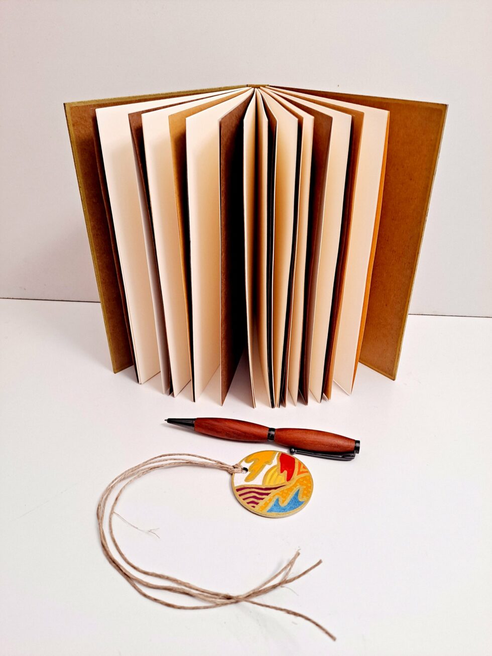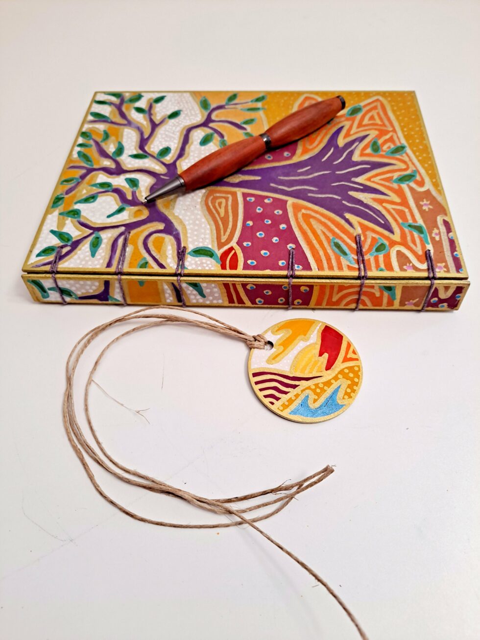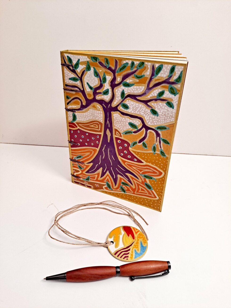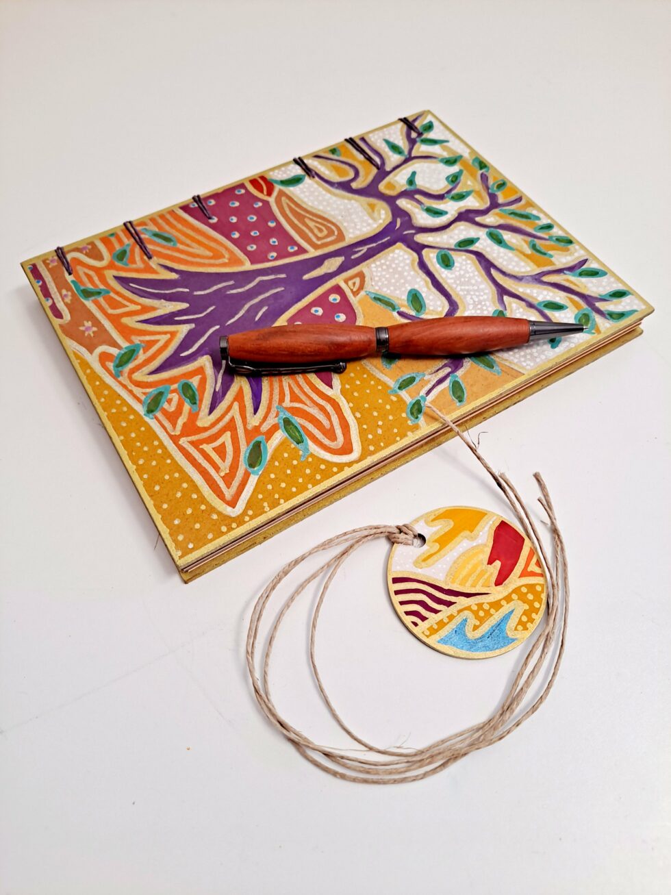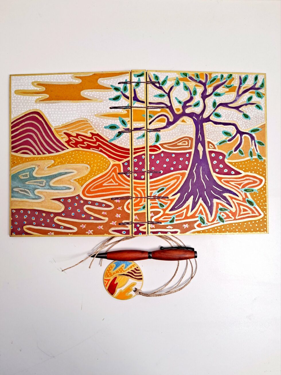Carnet Semainier KALI et son marque-pages assorti, format A5, couverture en bois peint à la main, reliure et pages cousues, carnet composé de 8 cahiers de 16 pages.