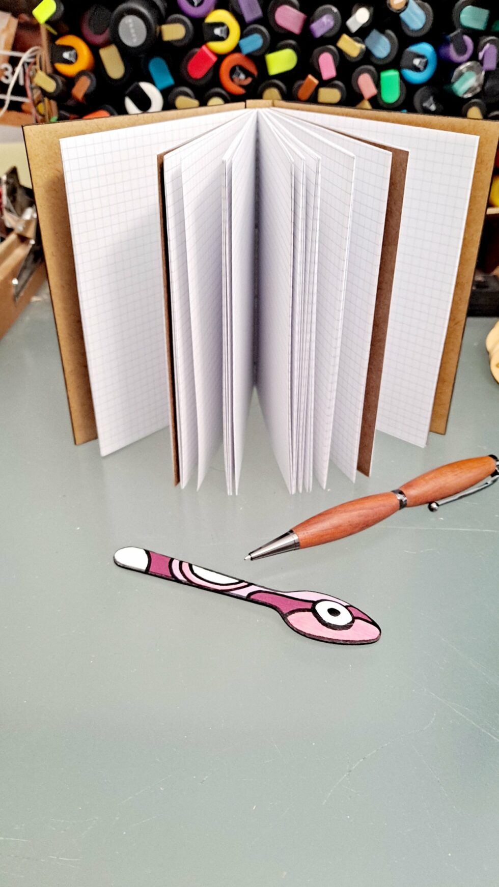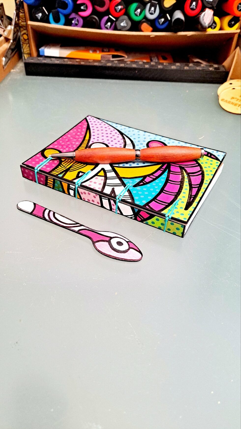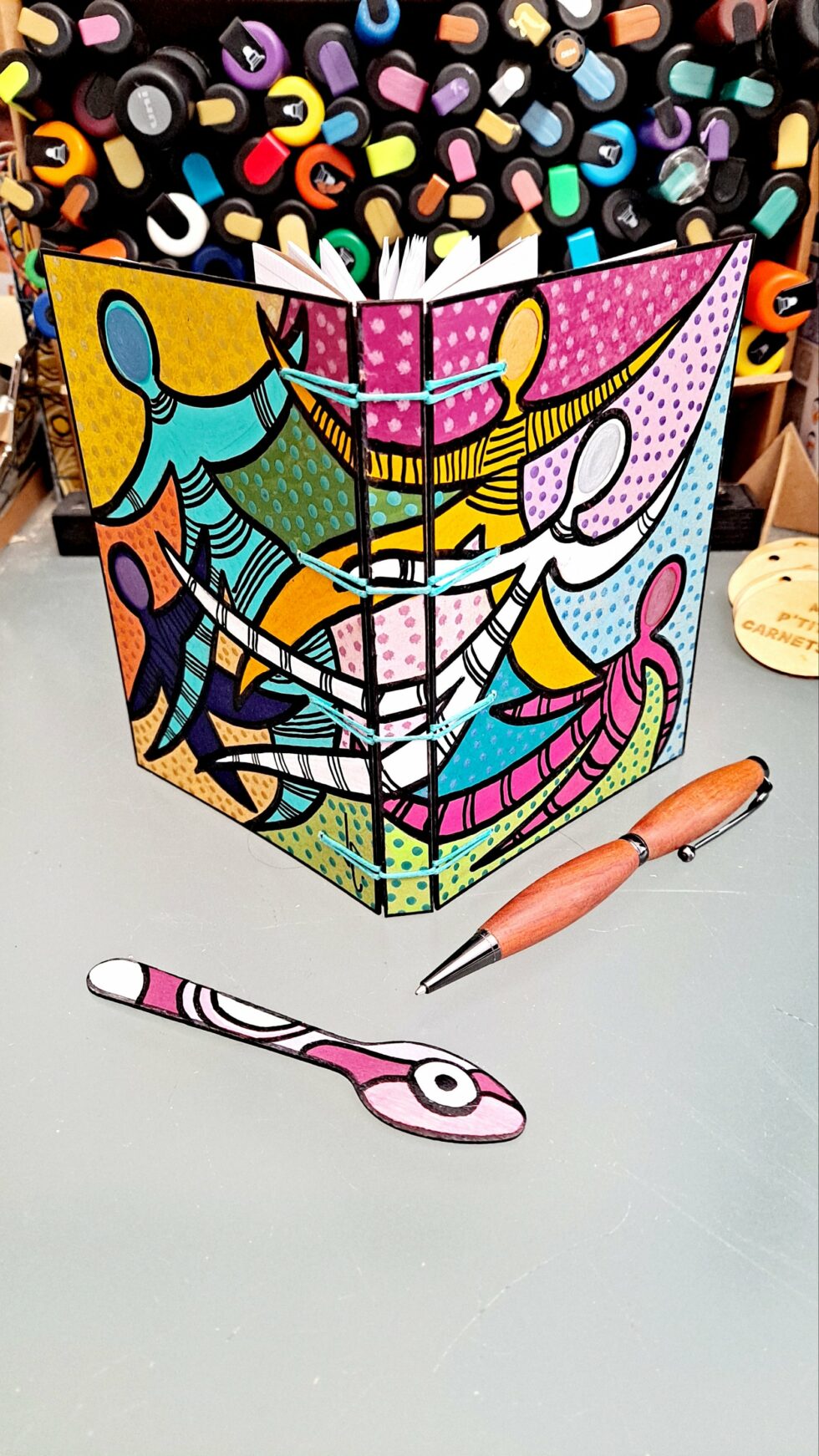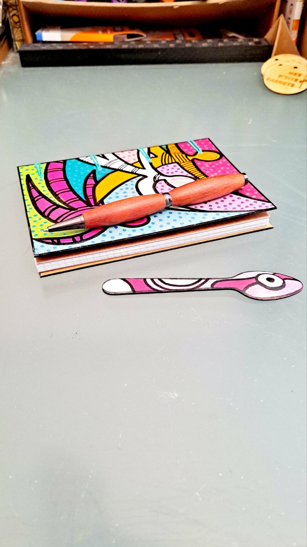 Carnet TCHATCHA, carnet artisanal, pièce unique, couverture en bois peint, motif original peint à la main, petit format A6 (10x15cm), 112 pages cousues, papier petits carreaux 90g, reliure Criss-Cross.