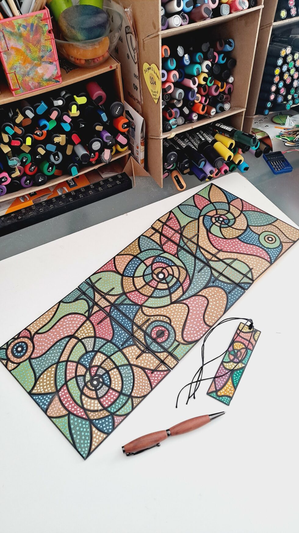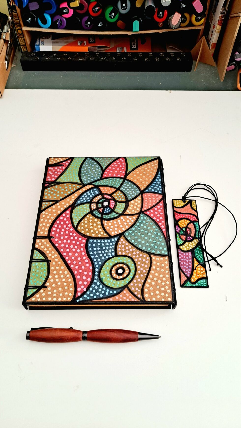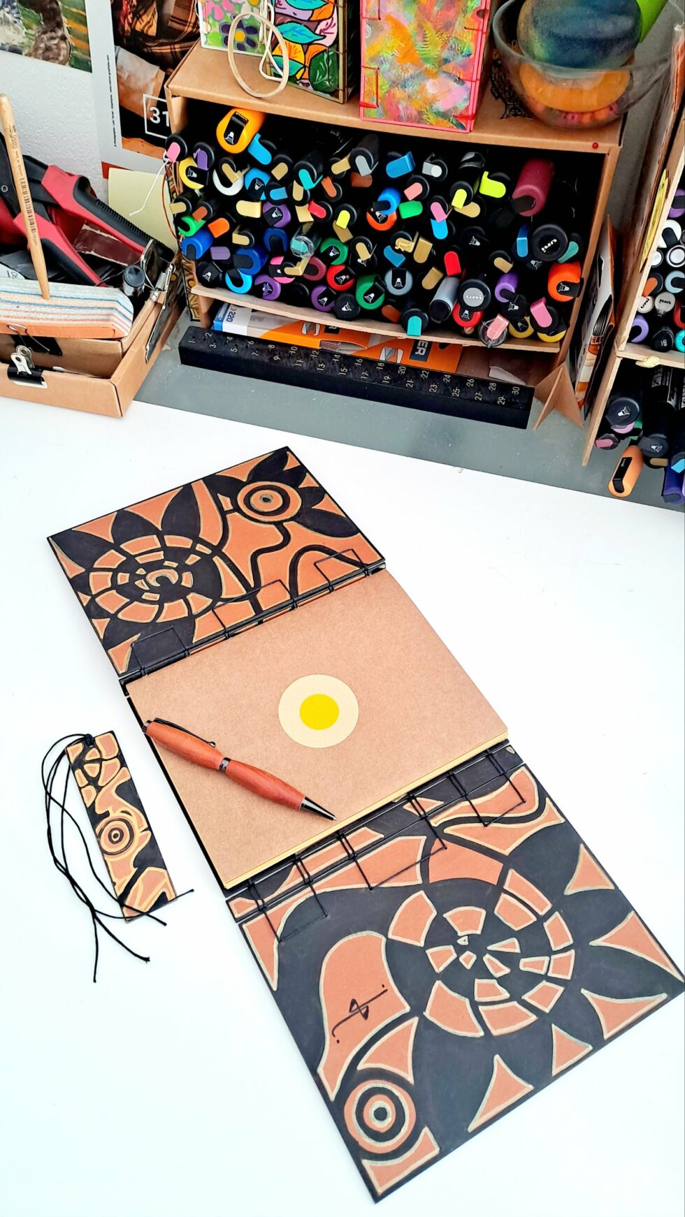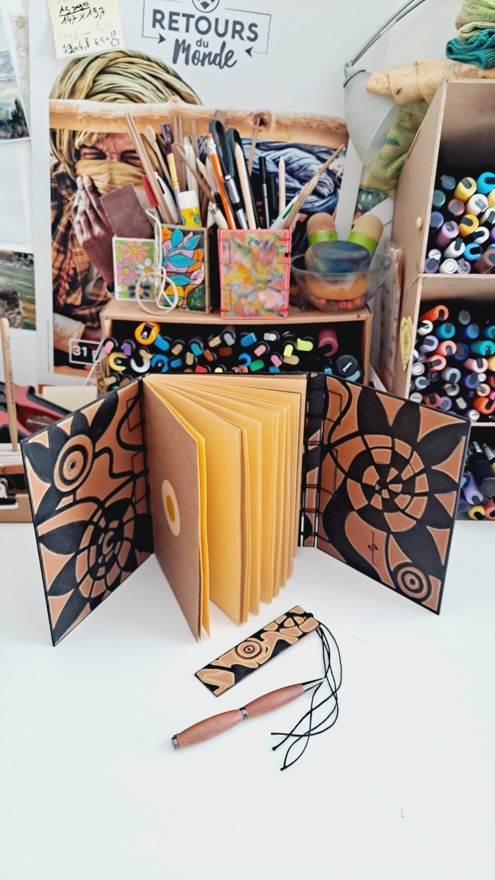 Carnet triptyque ELLIPSE et son marque-pages, pièce unique, 3 panneaux en bois peints à la main, la reliure secrète Belge, 112 pages cousues, papier kraft ocre 100g/m², format A5.