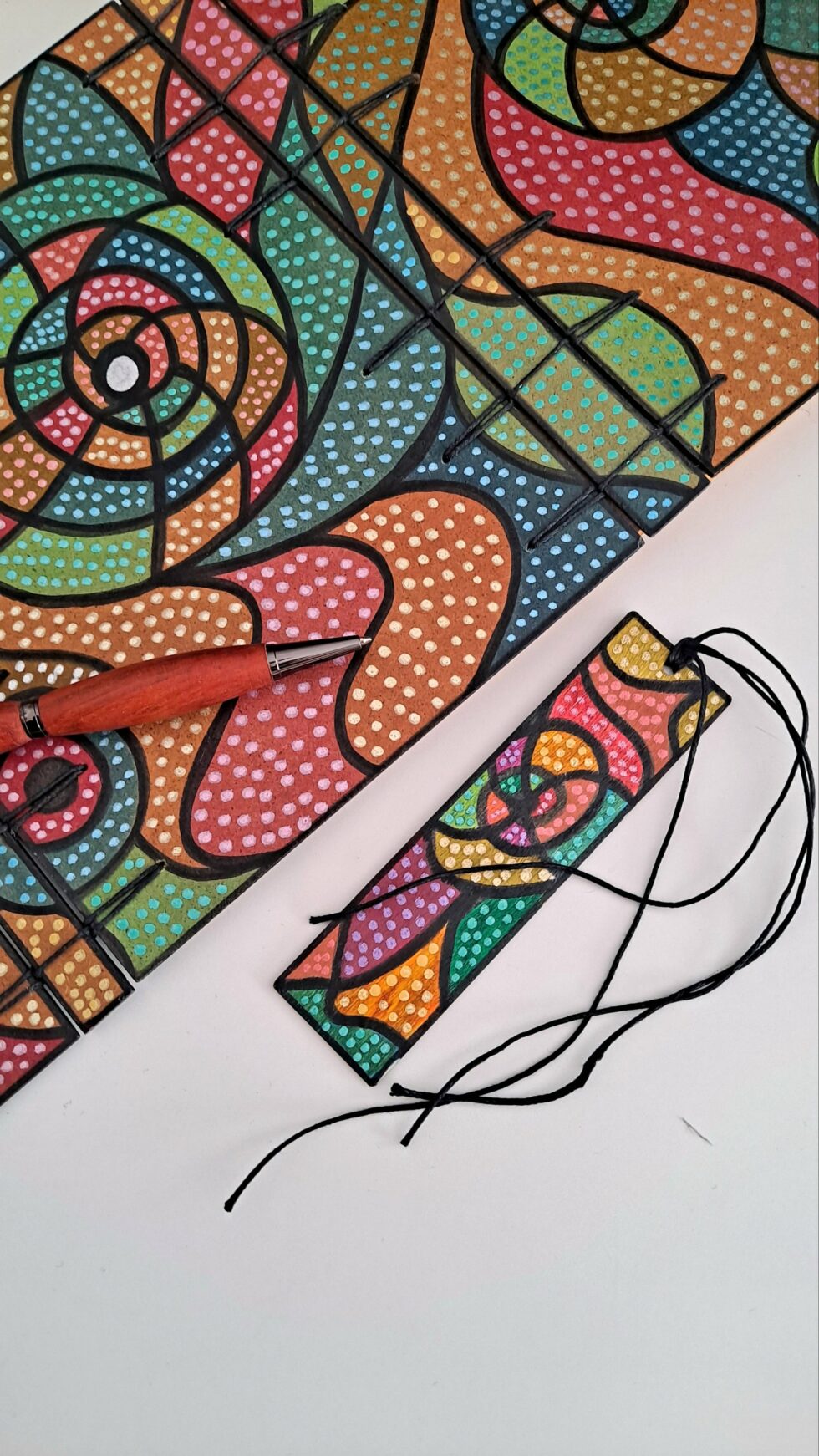 Je réalise à la main la reliure de chaque carnet avec la technique secrète belge, ou Criss-Cross. Cette reliure, visible à l’intérieur et à l’extérieur du carnet, reste esthétique tout en garantissant une ouverture à plat, parfaite pour écrire ou dessiner. Je varie les points de perçage et harmonise la couleur des fils avec les motifs peints, pour offrir des modèles uniques.