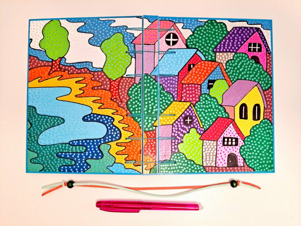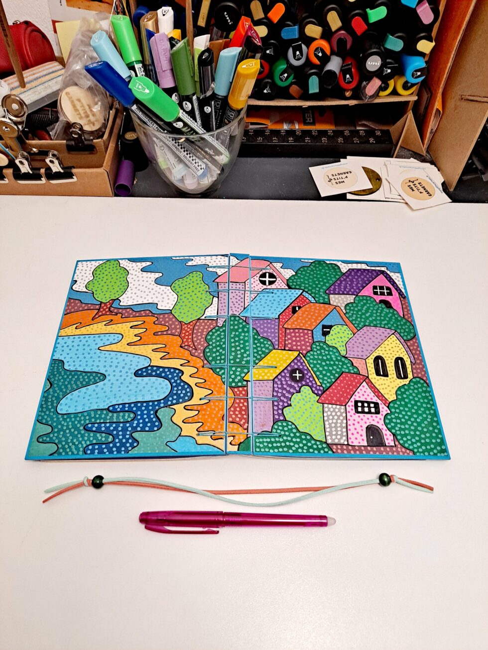 La reliure est réalisée à la main selon la technique appelée reliure Secrète Belge ou encore Criss-Cross.On doit cette technique à Anne Goy. Elle est visible à l’intérieur et à l’extérieur du carnet. Elle permet une ouverture à plat et une grande solidité. La couleur du fil de reliure s’harmonise avec le motif peint.